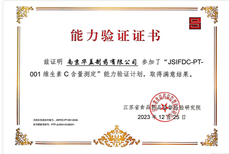 南京華蓋制藥質(zhì)量控制實(shí)驗(yàn)室參加了2023年度江蘇省食品藥品監(jiān)督檢驗(yàn)院JSIFDC-PT-001維生素C含量測(cè)定、JSIFDC-PT-002藥品的比旋度測(cè)定兩項(xiàng)能力驗(yàn)證,并于2023年12月27日收到兩份能力驗(yàn)證證書和結(jié)果通知單,兩項(xiàng)能力驗(yàn)證均取得滿意結(jié)果!